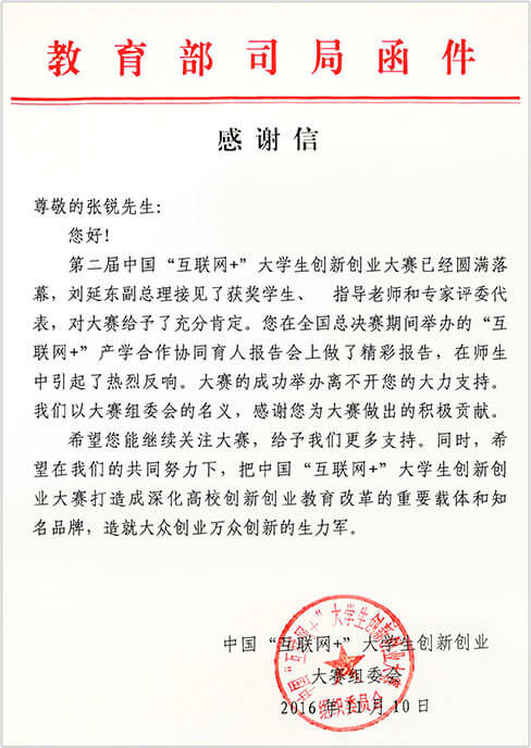 • 2018年,开云连续多年为中国国际互联网+大学生创新创业大赛做出积极贡献,获教育部来函致谢。